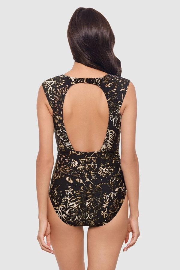 Party in the front, party in the back; this slimming tummy-control swimsuit features a deep plunge neckline framed by wide straps and accented with an adjustable spaghetti tie, plus a stunning open portrait back with a golden clasp closure behind the neck. Gentle shirring at the sides subtly enhances your figure, and the hidden support with removable padding adds shape to your bustline.