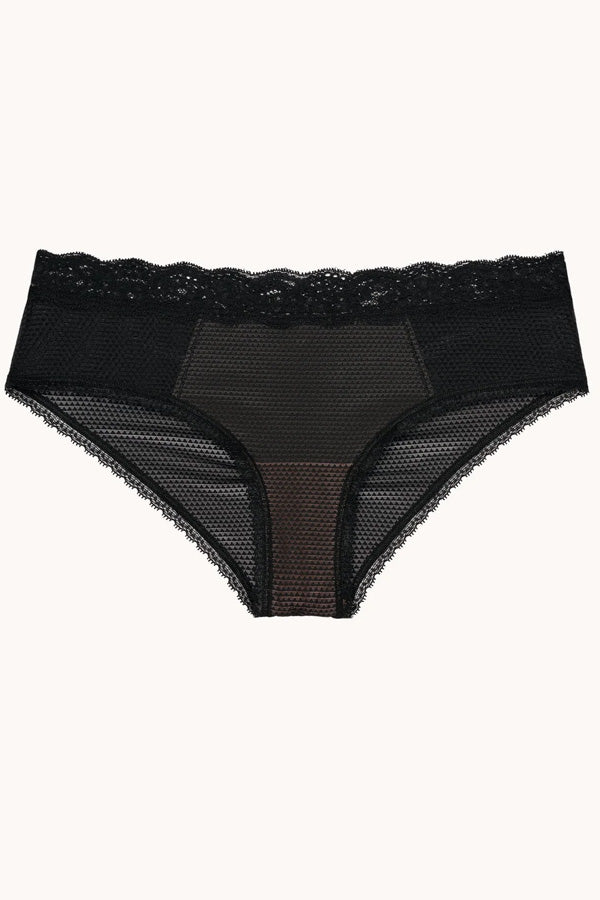 Crafted from semi-sheer, geometric-patterned tulle and trimmed at the waist and leg openings with beautiful lace, this hipster brief is a stylish yet comfortable option for everyday wear. It's ruched at the back to emphasise your curves, and has flat finishes for a discreet look under your clothing.