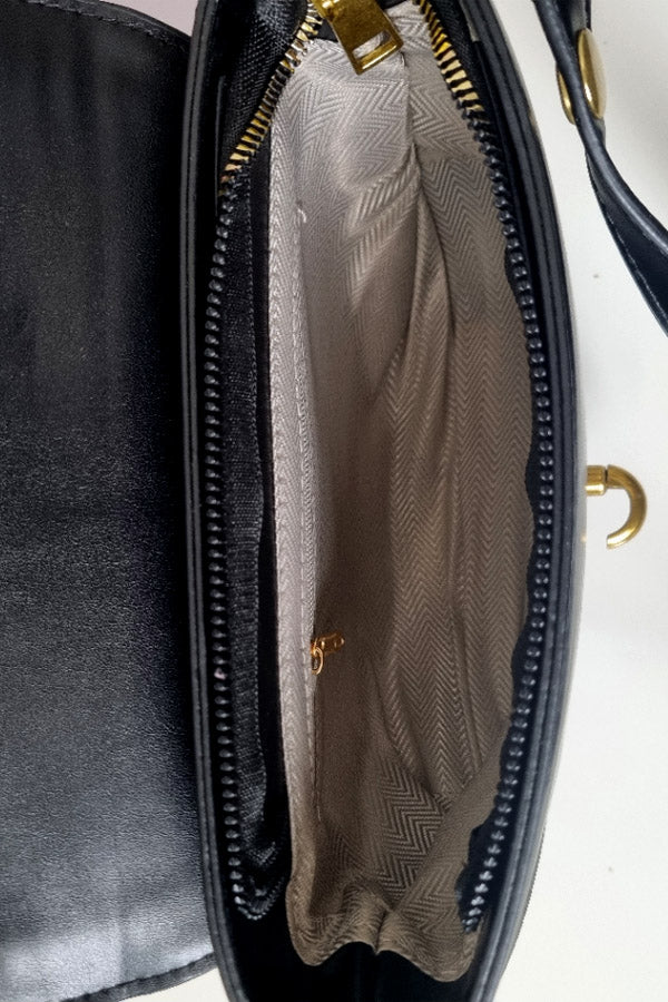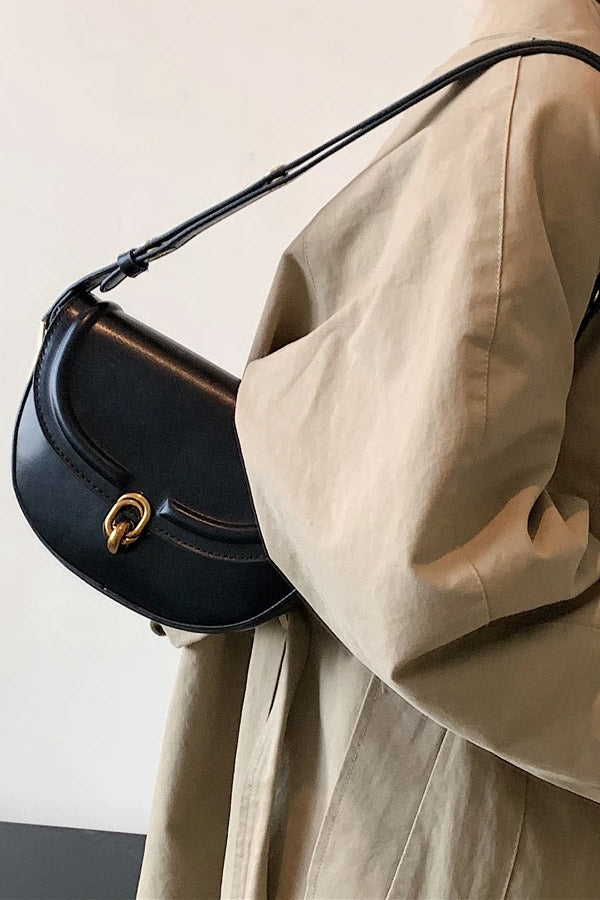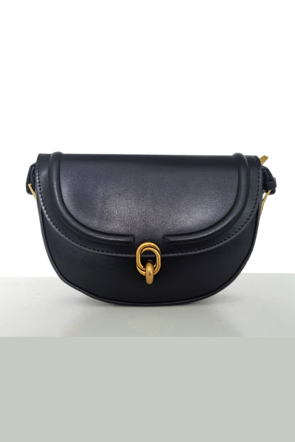 This sleek black saddle bag is the perfect accessory for any outfit. Crafted from leatherette and finished with brass toned hardware, this small but mighty bag is designed for durability and style. With adjustable shoulder straps, it offers both convenience and practicality.