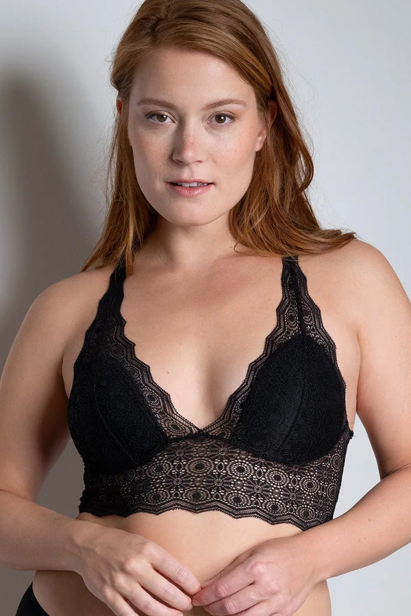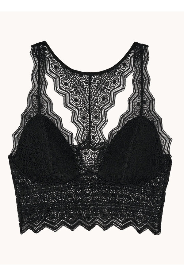Comfortable, chic, and able to be worn as both lingerie and a stylish crop top, this longline lace bralette features opaque, foam-padded cups and a racerback cut. Simply pull it on over your head - no hardware or fastenings.