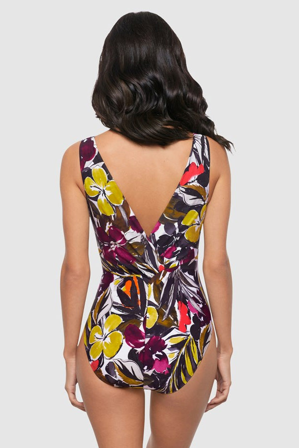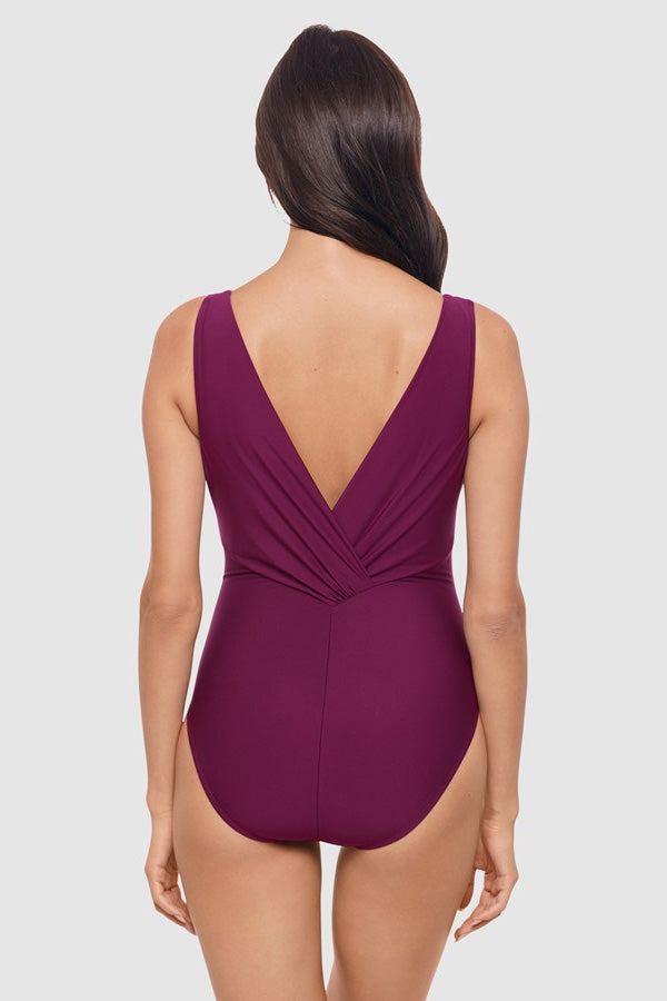 Take to the sea in daring style in this bold plunge neck swimsuit, which incorporates a chic hardware detail at the front and a draped, deep V back. More than just a tummy control swimsuit, this fashion-forward design provides all-over slimming and shaping, plus features ruching at the waist to subtly flatter your mid-section.