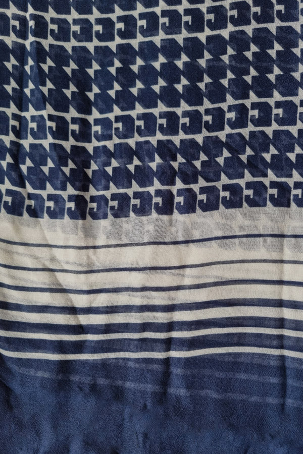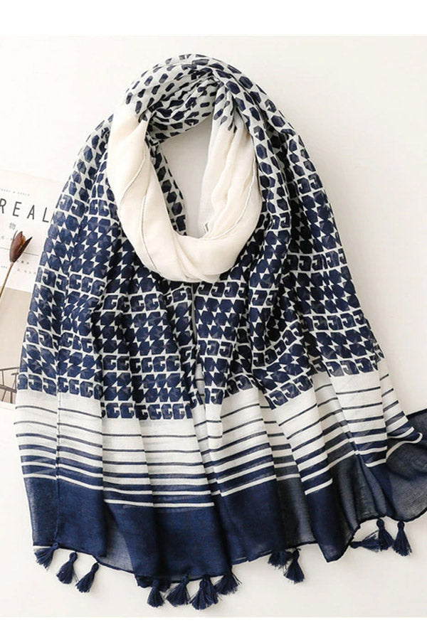 Elevate your Summer wardrobe with this large, breezy scarf in a graphic navy and white print. Finished off with matching navy tassels on the short ends.