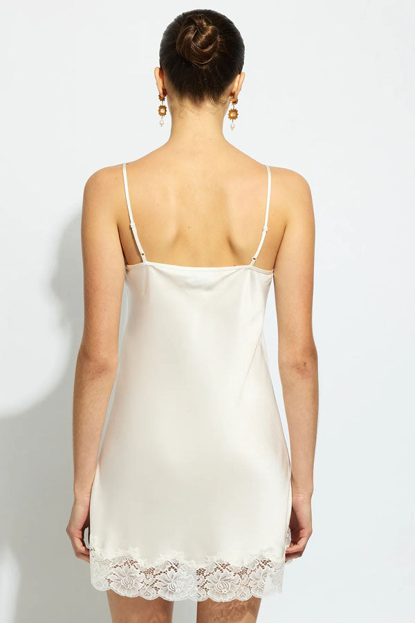 The Silk Lace Chemise is an enduring romance, made in soft silk and detailed with delicate hand-cut lace to celebrate the female form. A classic V-neck slip style that falls to the knee. Spaghetti straps from the same silk are adjustable for a perfect fit.