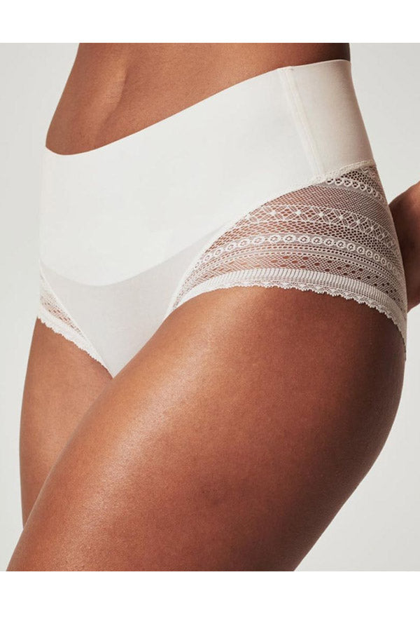 The Undie-tectable® illusion lace hi-hipster is designed with a bonded waistband to target your tummy and give you a completely smooth look under clothes.