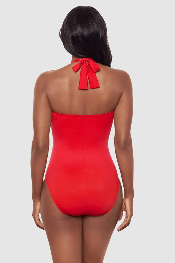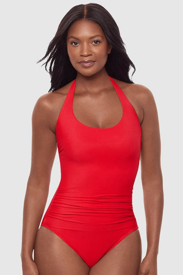 Get smooth, sleek, hourglass curves in this minimalist halter neck swimsuit, made with Miratex® fabric that delivers 3x the shaping power of regular swimwear fabrics without any need for bulky or uncomfortable linings. This halter tie swimsuit also lifts your bust thanks to hidden underwire, and has gentle draping to subtly flatter your tummy.